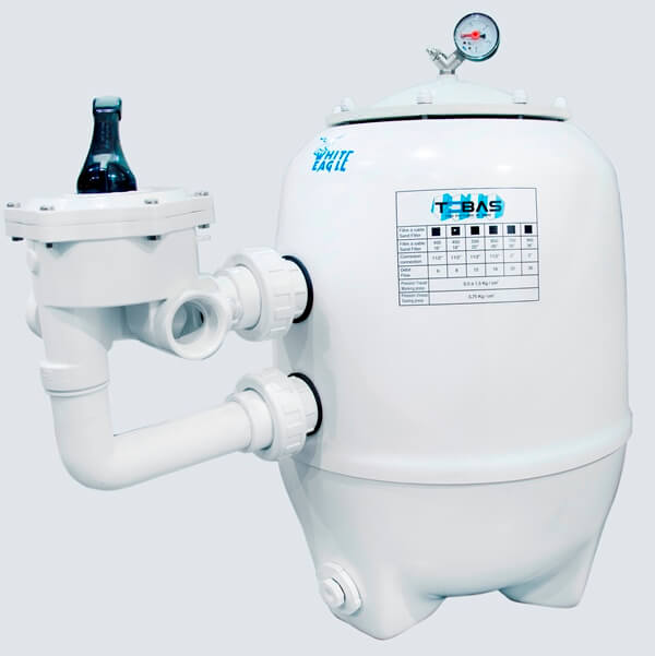 Poliestrowy Filtr basenowy Tebas White Eagle ,wykonany ze wzmocnionego włóknem szklanym poliestru ,zapewniającym sztywność konstrukcji.Mocna obudowa filtra nie pęka ,nie przepuszcza wilgoci .Filtr piaskowy do basenu White Eagle z zaworem 6 drogowym 2″ ,dzięki któremu można ustawiać wszystkie tryby pracy filtra : filtrowanie, płukanie wsteczne, płukanie powtórne, cyrkulacja i opróżnianie basenu.