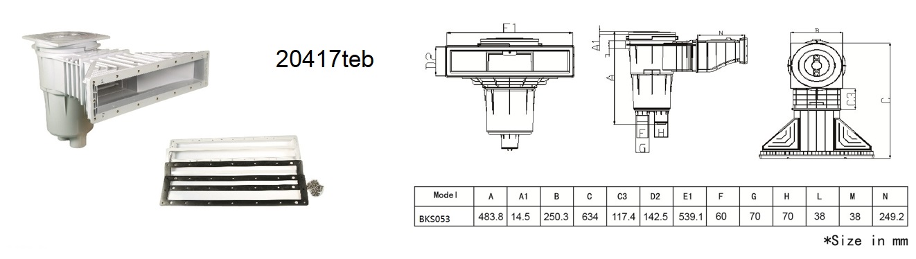 Skimmer zbiera wodę z około 35m2 powierzchni basenu.Dzięki wąskiemu wejściu,możliwe jest podniesienie poziomu wody w basenie.